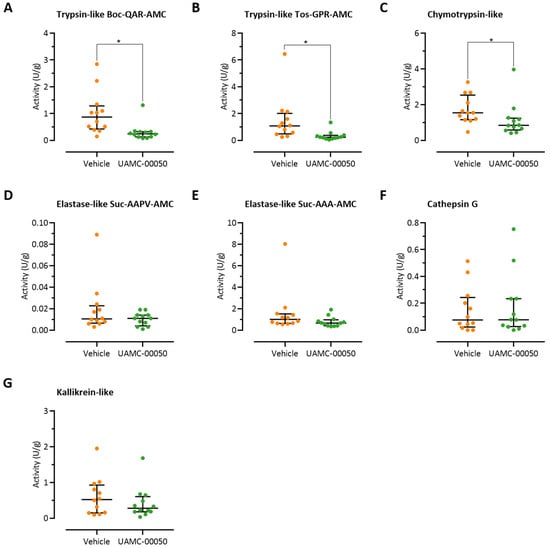 Proteolytic activities in colonic tissue of post-colitis rats treated with UAMC-00050 (5 mg/kg) or vehicle (5% DMSO). (A) Trypsin-like activity assessed using Boc-Gln-Ala-Arg-AMC. (B) Trypsin-like activity assessed using Tos-Gly-Pro-Arg-AMC. (C) Chymotrypsin-like activity. (D) Elastase-like activity assessed using Suc-Ala-Ala-Pro-Val-AMC. (E) Elastase-like activity assessed using Suc-Ala-Ala-Ala-AMC. (F) Cathepsin G activity. (G) Kallikrein activity. Proteolytic activities were analyzed using two-way ANOVA with ‘treatment’ and ‘group’ factors, followed by Mann–Whitney U tests with Bonferroni correction for multiplicity; n = 12 per group. Analysis was performed on the full dataset (involving the 4 combinations of control/post-colitis and vehicle/UAMC-00050), however visualization is split across Figure 2 and Figure 5, Figure S1 to allow for easier interpretation of the data. Data are presented including the median and IQR. Note: * p < 0.05; significantly different from post-colitis + vehicle.