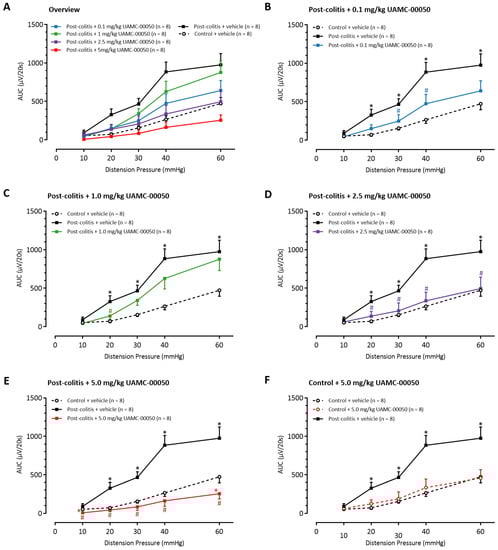 The effects of intracolonic administration of UAMC-00050 (0.1–1.0–2.5–5.0 mg/kg) and its vehicle (5% DMSO in H2O) on visceral sensitivity in post-colitis (filled squares) and control (open circles) rats. Statistical analysis was performed on the complete dataset (A), however separate graphs (B–F) were generated for each dose for the purpose of clarification. Data are presented as means ± SEM. Generalized estimating equations using an unstructured working correlation matrix, followed by a least significant difference (LSD) post hoc test; n = 8 per group. Note: * p < 0.05; significantly different from control + vehicle. Note: # p < 0.05; significantly different from post-colitis + vehicle.