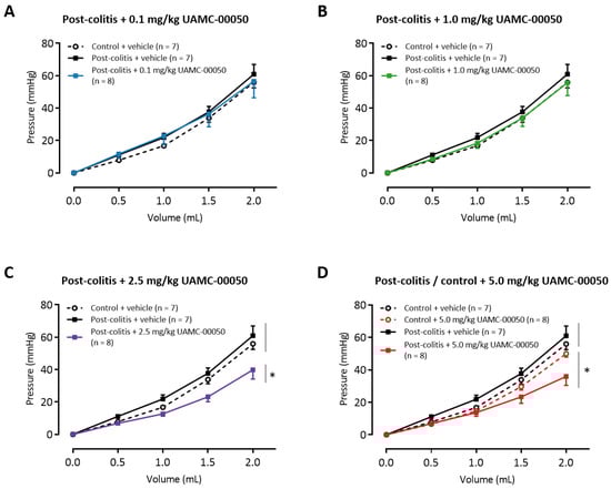 Vehicle-treated post-colitis animals displayed a colonic compliance similar to control animals (Figure 8A). Intracolonic treatment of the animals with low doses of UAMC-00050 (0.1 mg/kg–1.0 mg/kg) did not alter colonic compliance (Figure 8A,B). Compared to vehicle-treated animals, a single treatment of animals with 2.5 mg/kg UAMC-00050 (Figure 8C) or 5.0 mg/kg UAMC-00050 (Figure 8D) resulted in lower intracolonic pressures when graded volumes of water were applied. Hence, colonic compliance is increased in these animals.