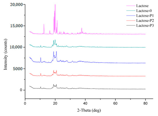 In summary, the spray-dried lactose (Lactose-0, Lactose-P1, Lactose-P2, and Lactose-P3) was mainly in crystalline structure and changed the crystal form, which was consist with Figure 2.