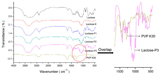 The FTIR of materials. Lactose, the raw material; Lactose-0, processed without PVP K30; Lactose-P1, processed with 1% PVP K30; Lactose-P2, processed with 2% PVP K30; Lactose-P3, processed with 3% PVP K30.