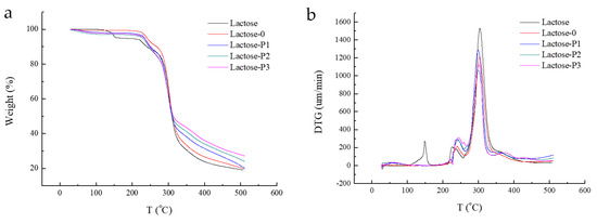 The (a) TG and (b) DTG analysis of materials. Lactose, the raw material; Lactose-0, processed without PVP K30; Lactose-P1, processed with 1% PVP K30; Lactose-P2, processed with 2% PVP K30; Lactose-P3, processed with 3% PVP K30.