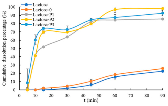 In vitro dissolution behavior profiles of Cur-loaded powder. Lactose, the raw material; Lactose-0, processed without PVP K30; Lactose-P1, processed with 1% PVP K30; Lactose-P2, processed with 2% PVP K30; Lactose-P3, processed with 3% PVP K30.