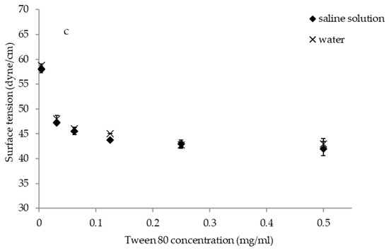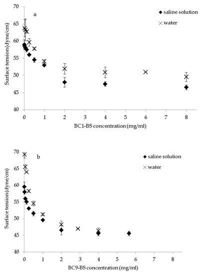 Our previous studies demonstrated that the surface tension of BC1-BS and BC9-BS in water decreased as biosurfactant concentration increased [15,18]. In this study, the surface-activity, and the CMC of biosurfactants were also determined in a saline solution. Figure 1a,b shows the comparison between surface tension values obtained by dissolving BC1-BS and BC9-BS in water or in a saline solution. When BC1-BS biosurfactant was solubilized at concentrations from 0.016 mg/mL to 8.0 mg/mL in saline, the surface tension decreased from 59.0 ± 1.4 to 46.5 ± 0.7 dyne/cm, whereas, in the case of BC9-BS at concentrations ranging from 0.004 mg/mL to 5.65 mg/mL, the surface tension decreased from 59.5 ± 0.7 to 45.5 ± 0.7 dyne/cm. Overall, for both BS, a reduction in surface tension values was observed in the saline solution with respect to water (p < 0.05). This result could be attributed to the presence of positively charged amino acids: arginine for BC1-BS [18] and histidine for BC9-BS [15]. As reported in the literature, for ionic surfactants, the presence of electrolytes causes a decrease in surface tension as a result of a lower repulsion between similarly charged ionic head groups [30]. However, the CMC values determined for BC1-BS and BC9-BS in saline solution did not differ from the values obtained in water (p > 0.05); they were 2.5 mg/mL and 2.0 mg/mL, respectively. On the contrary, the surface-activity of Tween 80 was not influenced by the presence of sodium chloride in water (Figure 1c). This result was in agreement with previous findings confirming that, in the case of non-ionic surfactants, the repulsion between the head groups is not a limiting factor for micellization and that no change in CMC upon addition of salt is observed [31].