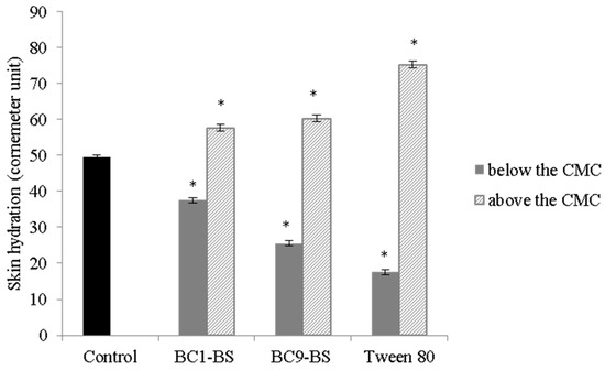 In order to evaluate surfactant influence on skin properties, skin hydration was measured in the presence of the tested surfactants. Figure 3 shows the values of skin hydration (Corneometer) after 60 min of treatment with BC1-BS, BC9-BS, and Tween 80 at concentrations below (1/2-fold lower than their CMC) and above the CMC (10-fold higher than their CMC). For all the tested surfactants at concentrations below the CMC, a reduction in skin hydration values with respect to the control was observed (p < 0.05). This behavior was probably attributed to the presence of the fatty acid portions of surfactants that could form a lipophilic environment on the skin surface. Our conclusion was in agreement with data obtained in the work of Knoth and co-workers, in which the authors observed the same trend with a biosurfactant obtained from the corn wet-milling industry [10] sharing the same lipopeptide nature of BC1-BS and BC9-BS. Moreover, previous findings reported that lipid nanoparticles, able to provide a lipid film on top of the skin, led to a decrease in the measured skin hydration [39,40,41]. Interestingly, BC9-BS led to a greater reduction in the hydration skin with respect to BC1-BS, probably as a consequence of the presence of fatty acids with a longer hydrocarbon chain.