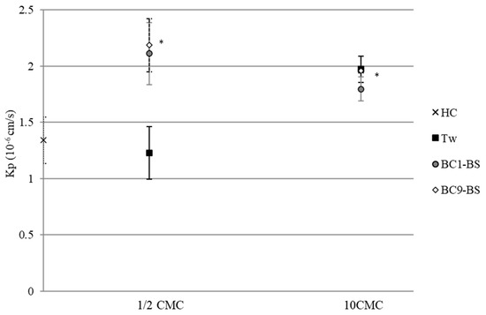 Moreover, despite being well known that micelles do not penetrate the skin because of steric hindrance [49], for all the tested BS, at a concentration 10-fold higher than CMC, HC permeability coefficients were higher than the Kp of the control (p < 0.05).