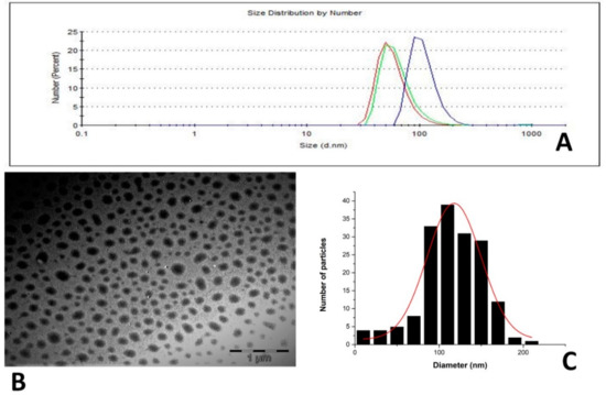 The size distribution of the particles from the TEM image obtained without staining (Figure 1B) showed a Gaussian distribution with a peak at approximately 120 nm (Figure 1C), correlating with the particle size distribution by number derived from the evaluation of the same sample by DLS (Figure 1A). All the formulations showed a negative zeta potential in the range of −54 to −63 mV (Table 1). Particle size and zeta potential are two important parameters for maintaining in vivo integrity and behavior of nanoparticles. These observed negative zeta potentials are in line with what has been reported in previous studies using crude soy lecithin and a thin-film hydration method [23,30].