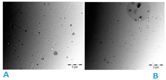The TEM images obtained after staining the samples with uranyl acetate (Figure 2) showed the spherical shape of the 5-FU encapsulated liposomes with little or no fusion or aggregation observed. This could be explained by the high negative zeta potential observed. This result matches DLS measurements of the samples. The zeta potential controls the stability of the liposomal formulations under physiological conditions [36]. However, further real-time studies would be necessary to confirm the stability of these formulations under physiological conditions.