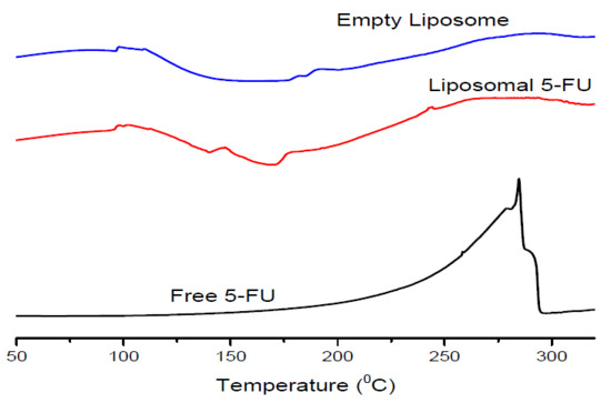 The DSC thermogram of free 5-FU showed a sharp melting endothermic peak at about 287 °C, close to the melting point of the compound (283 °C). The melting peak at about 287 °C was followed by decomposition, as reported in the literature [4]. The apparent disappearance of the endothermic peak in the liposomal 5-FU confirms the encapsulation of 5-FU and suggests conversion to an amorphous form (Figure 3). The endothermic transitions between 100 and 170 °C observed for the empty liposomes and the liposomal 5-FU are likely a melting endotherm for the phospholipids [37].