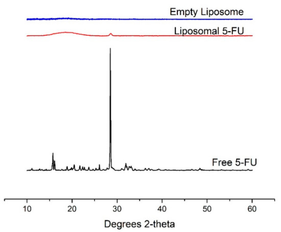 X-ray diffraction pattern of free 5-FU, liposomal 5-FU and empty liposomes.