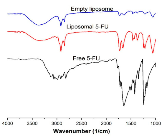 The interactions of the free 5-FU, liposomal 5-FU and empty liposomes were studied using FT-IR. As can be seen in Figure 5, characteristic FTIR absorption bands of 5-FU can be found in the liposomal 5-FU. The characteristic band at 1660 cm−1 in the spectrum of free 5-FU is the stretching vibration of the C=O group [38]. The bands at 1060 and 1235 cm−1 in the liposome formulations can be related to the stretching vibration of the P=O in the phosphate group. The bands observed at about 2750 cm−1 in all the formulations are the C-H stretching bands. The characteristic peak at 1660 cm−1 in the free 5-FU corresponding to the C=O stretching vibration shifted to about 1680 cm−1 in the liposomal 5-FU. The spectral results further show that the drug was successfully encapsulated in the nanoparticles.