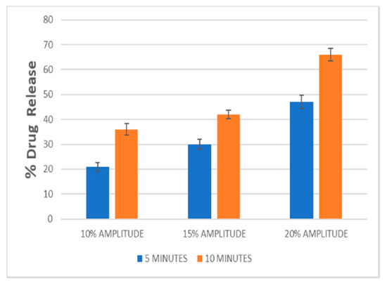 Drug release from liposomes is affected by applied ultrasound [40]. We investigated amplitudes of 10%, 15% and 20% and the 5-FU released increased in proportion to the increase in applied amplitude, which could be a result of the introduction of transient cavitation in the liquid release medium (Figure 7). This cavitation might have occurred near the liposomal membrane or through small cavitation nuclei in the liposome aqueous core. The liposomal formulations were irradiated for an exposure time of 5 min and 10 min. We inferred that the higher the ultrasound amplitude and the longer the exposure time, the greater the amount of energy density transferred to the nanocarrier, which directly altered the quantity of 5-FU released. These data show that a large proportion of 5-FU can be released from the liposomes on exposure to low-frequency ultrasound applied over a short time. This could result in the availability of a higher concentration of the compound in the cancer cells when triggered, thereby resulting in prolonged circulation time with reduced off-target toxicity.