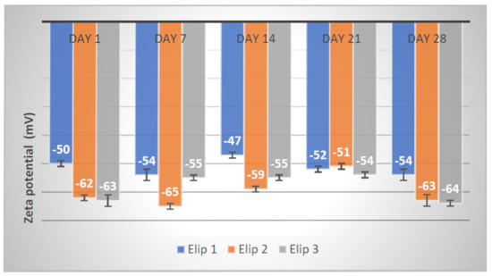 As shown in Figure 9, all the echogenic liposomes studied for stability maintained their zeta potential within the range of −47 to −64 mV from the first day to the 28th day. This confirmed that the nanocarriers were stable for the period under storage at 4 °C as no fusion or aggregation was observed. The addition of d-mannitol in the formulation, which serves as a cryoprotectant, and the presence of carbohydrates in the phospholipids, were assumed to contribute to the echogenic liposomal formulations’ stability.