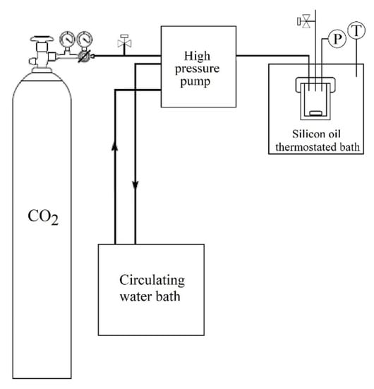 PLLA and LLDPE films were weighted (m0) and placed vertically into a 10 mL stainless steel high-pressure cell. The reactor was immersed in a silicone oil thermostated bath at 80 °C, and CO2 was introduced into the reactor using a high-pressure pump (model SFC P-50A, Thar Technologies, Pittsburgh, PA, USA) until a pressure of 30 MPa was achieved (Figure 2). The temperature and pressure were kept constant for 3 h. The depressurization was performed by dipping the reactor in dry ice to freeze the CO2 to prevent its desorption from the polymeric matrices [46]. The samples were immediately weighed after being removed from the high-pressure cell (ms) and continuously weighted until mass stabilization (md). The amount of CO2 (mco2) sorbed into the films during the scCO2 impregnation process was not desorbed during the depressurization process. Similar to the soaking process, the scCO2 absorption was calculated using Equation (1).