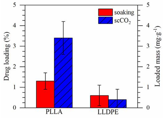 The scCO2 impregnation resulted in a drug loading 2.6 times higher than the soaking method for PLLA (3.4 ± 0.8 vs. 1.3 ± 0.4%) (Figure 3). For LLDPE similar values were obtained with both methods (0.4 ± 0.5 vs. 0.6 ± 0.5%). The Tukey test revealed that only PLLA impregnated with the scCO2 method presented significant differences from the other samples, i.e., PLLA impregnated with soaking and both LLDPE had similar drug loadings.