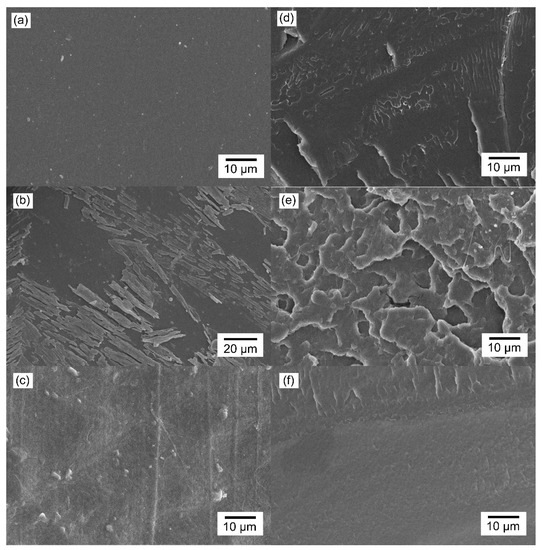 SEM analyses were performed to observe the impact of the impregnation methods on the polymer surfaces and cross-sections. Needle-shaped crystals of aspirin with a width between 1 and 6 μm and a heterogeneous length between 6 and 120 μm were observed on the surface of the soaking-PLLA samples (Figure 4b). Large aggregates of parallel aspirin needles adhered to the PLLA surface but did not cover the entire surface (Supplementary Materials Section S3). However, such aspirin crystals were not observed on the surface of the scCO2-PLLA samples (Figure 4c) and the surface irregularities are attributed to the Teflon sheets in contact with the polymer used during hot pressing. The morphology of the neat PLLA cross-section was dense with no macropores (Figure 4d). Similarly, no macroporosity was evident in SEM images of the cross-section of scCO2-PLLA; despite the irregular fracture surface, the sample was dense and homogeneous (Figure 4f). The cross-section of the soaking-PLLA sample showed irregular polymer layers orientated along the cross-section, few irregular closed macropores were present, and the sample was less dense than neat PLLA (Figure 4e), as observed elsewhere for PLA in contact with ethanol and subsequent drying at 70 °C [54]. Supplementary Materials Section S3 presents additional images with lower magnifications (Figures S4–S6).