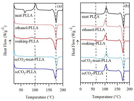 DSC thermograms of neat PLLA, PLLA treated with the impregnation solvent, and PLLA impregnated with aspirin using the soaking method and scCO2 method, (a) first heating and (b) second heating.