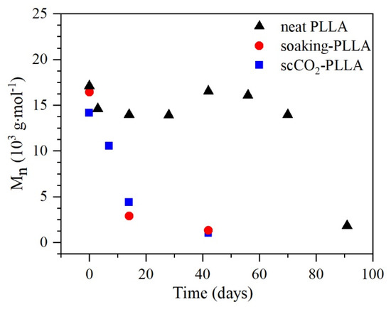 The Mn of the PLLA samples submitted to degradation over time (Figure 7) was estimated using 1H NMR analyses. The Mn of the initial samples (t = 0 days) is lower for the impregnated PLLA, showing that the impregnation process promoted some degradation and that it was higher for the scCO2-PLLA, which presented the lowest Mn. Moreover, the Mn of neat PLLA decreases significantly only after 70 days, while the Mn of the impregnated samples decreased faster during the first 14 days, showing that the degradation is much faster for the impregnated samples. Finally, the degradation appears to be slightly faster for the soaking-PLLA sample.
