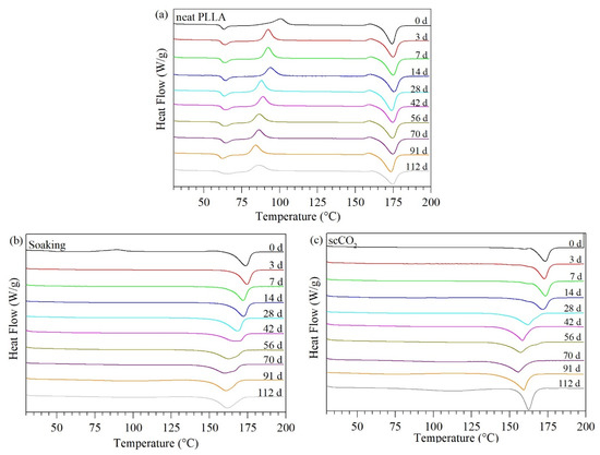 First heating DSC thermograms of PLLA during the degradation study at 37 °C in PBS of (a) neat PLLA, (b) PLLA impregnated using the soaking method, and (c) PLLA impregnated using scCO2 impregnation method.
