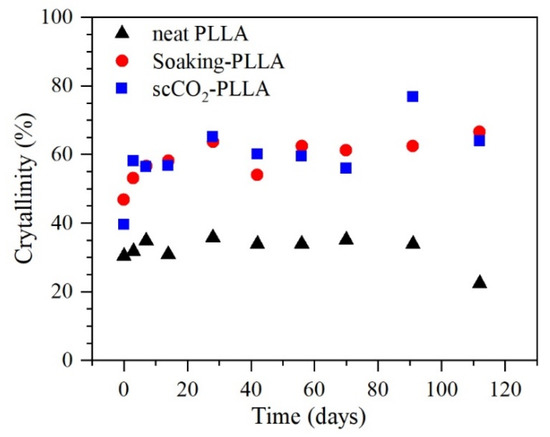 DSC analyses revealed the PLLA crystallinity and thermal properties evolution throughout the degradation study (Figure 8). For all samples, an increase in the crystallinity during the degradation study was observed (Figure 9). The neat PLLA crystallinity increased from 30.4% to 34.0% after 112 days (~3.7 months) in PBS, whereas the crystallinities of soaking-PLLA and scCO2-PLLA increased from 46.8% to 66.5% and from 39.6% to 63.9%, respectively, in the same period. The neat PLLA Tc decreased 8.2 °C over the degradation period while its Tg and Tm presented almost no change (<1 °C), according to Figure 8. The Tm of the samples impregnated using both techniques progressively shifted to lower temperatures, especially after 28 days of degradation.