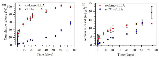 Comparison of the release profile of aspirin from soaking-PLLA and scCO2-PLLA samples, (a) cumulative release and (b) quantity of aspirin released.