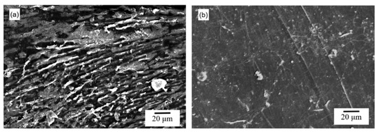 Aspirin release from soaking-PLLA and scCO2-PLLA samples was tested in PBS to verify whether the two methods could control drug release (Figure 10). The Korsmeyer–Peppas model that considers a possible burst effect, was applied to determine the release mechanism. Soaking-PLLA showed a burst release corresponding to c.a. 15% (release until 1.5 h) as indicated by parameter b in the Korsmeyer–Peppas model, related to Equation (6) (Table 5). The SEM images of the soaking-PLLA surface after immersion in PBS during different times showed that the aspirin crystals totally dissolved after 1 h 30, so tcoating was estimated to be 1.5 h (Figure 11). Conversely, scCO2-PLLA did not exhibit such a burst release, parameter b of the Korsmeyer–Peppas model being smaller than the deviation, and only 3% of impregnated aspirin was released within 24 h, which is consistent with the absence of aspirin on the surface (Figure 4c). The release of aspirin from scCO2-PLLA was much slower than from soaking-PLLA. After 74 days, c.a. 60% of the drug was released from scCO2-PLLA, whereas the whole aspirin content was released from soaking-PLLA after 60 days. According to the kinetic parameter n of the samples (Table 5), aspirin was released from soaking-PLLA according to the Fickian diffusion mechanism whereas its release from scCO2-PLLA occurred through diffusion and matrix erosion.