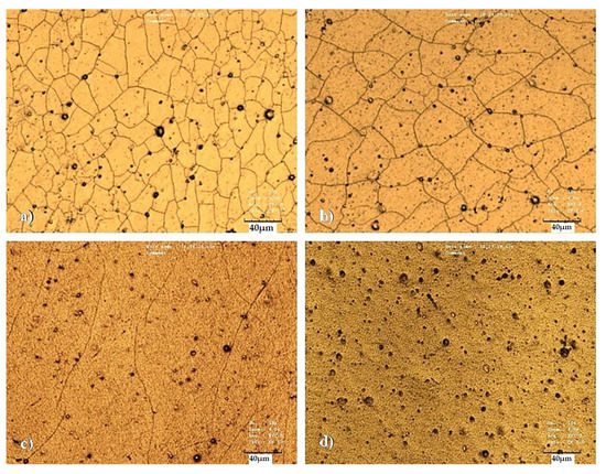 The main idea of this study was a development of a very simple but unique technique of how to prepare a wrinkle-like patterned PLLA substrate with gold and titanium nanolayers enhancing the antibacterial properties of the biopolymer surface. As part of the study of thermally stressed biopolymer composites, we firstly focused on the evaluation of the material surface morphology and changes in biopolymers caused by thermal stress. For this purpose, laser confocal microscopy (LCM) was chosen as the first preliminary method to study changes in the material surface morphology. Figure 1 shows images of the surfaces of unheated samples, in which a primary Au layer was applied to the samples, on which a titanium layer was deposited so that the total metal thickness was set to 30 nm. The images show the formation of a typical structure for titanium nanolayers, i.e., the formation of certain “cracks” in the layer, which occurred during sputtering. The major effect of the titanium layer, which has a thickness of 28 nm in Figure 1a and which gradually fades from 25 and 20 to 5 nm (Figure 1b–d), is evident. It should also be mentioned that the titanium particles have high energy due to the deposition parameters when they hit the substrate, which can also lead to a local increase in the temperature of the sputtering head. Figure 1d shows the most pronounced porosity of the PLLA surface after the application of the metallic layers. We have also studied the surface of unheated titanium-based samples on which gold was deposited to the total thickness of 50 nm (i.e., the metals were deposited in reverse order). The influence of the titanium layer on the material surface morphology was determined to be similar as in Figure 1, with titanium as the bottom layer and gold at the top layer, which led to the formation of a heterogeneous surface structure with microcracks, which are closely related to the thickness of the Au layer, respectively to the different mechanical properties of gold and titanium layer. At higher values of Au thickness, it achieves more homogeneous properties in terms of surface morphology compared to the Ti layer and the surface, therefore, has fewer surface irregularities.