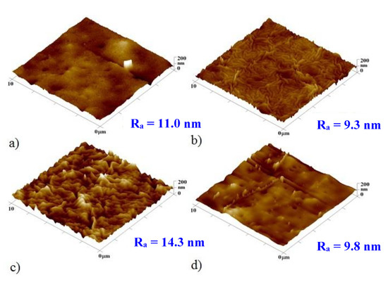 Sample surface morphology was examined by atomic force microscope (AFM) Dimension ICON (Bruker Corp., Billerica, MA, USA); ScanAsyst mode in the air was used for determination. Silicon Tip on Nitride Lever SCANASYST-AIR with a spring constant of 0.4 N∙m−1 was used. NanoScope Analysis software was applied for data processing. The mean roughness values (Ra) represent the average of the deviations from the center plane of the sample.