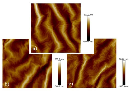 The samples with Au as the primary layer after heating have shown an intense increase in surface roughness with the formation of wavy structures caused by thermal stress. A significant effect of titanium on the surface roughness is evident. The PLLA sample with the highest thickness of a titanium layer (28 nm) also exhibited the largest surface roughness. As the proportion of the titanium layer decreased and the proportion of gold increased, so did the surface roughness. The sample with the biggest thickness of the gold layer (25 nm) and 5 nm layer of titanium had almost 50% of the roughness of the roughest sample. Sample a, with a 10-nm gold layer, retained the primary wrinkled structure formed by the deposition even after heating, which also increased the roughness of this structure. Figure 4 shows the surface of unheated samples with a titanium bottom layer and a gold top layer. The formed primary wavy structure is apparent in the images with 5 and 10 nm titanium layers. The corrugated surface with a titanium layer of 10-nm thickness exhibited the largest roughness of the whole sample series. Samples with a base titanium layer after heat treatment are shown in Figure 5. A wrinkled structure was formed by thermal stress induced by a temperature close to the Tg of the polymer. The sample roughness was also affected by the ratio of metals, increasing with a growing thickness of the titanium layer. On the sample with only 2 nm of titanium, the wrinkled structure exhibited a regular arrangement. Samples with a 5- and 10-nm titanium layer retained the primary ripples even after heating. The sample with a 25-nm titanium layer had the highest surface roughness compared to the others, but the ripples were not regular.