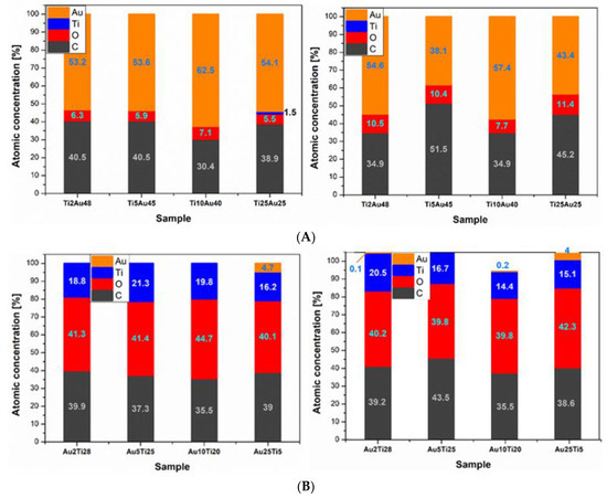 The concentration of the individual elements contained in the surface layer of the samples with the lower layer of titanium and the upper layer of gold obtained by XPS. (A) The results for samples with titanium bottom layer and gold upper layer before and after the heating process. (B) The results of the samples with the gold bottom layer and the titanium upper layer before and after the heating process. Unheated samples on the left, samples after heating on the right.