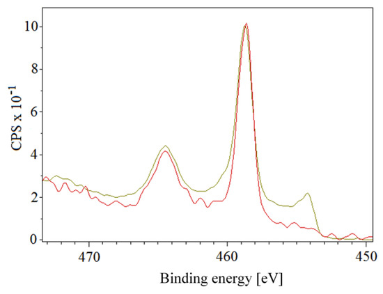 The results of the samples with the gold bottom layer and the titanium upper layer are shown in Figure 8B. The thickness of the upper titanium layer was 5, 20, 25, and 28 nm. In the case of unheated samples, the presence of gold appeared only for the samples with the greatest Au thickness of 25 nm. The concentration of titanium was about one-third compared to samples with a gold surface. At the same time, there was a much higher proportion of oxygen, which indicates the oxide layer formed in the Ti nanolayer. A slight decrease in titanium concentration was observed on heated samples. The presence of pure metal or titanium dioxide was examined in more detail. Figure 9 shows measurements at two angles (9° and 90°) for an unheated sample with a sputtered 2-nm gold layer and 28 nm of titanium. It is apparent that when measuring at a sharp angle (9°, red curve), only titanium dioxide with a binding energy of about 459 eV was detected, while at a perpendicular angle measurement, a metal with a binding energy of about 454 eV also appeared in the analyzed layer. The measurement, thus, shows that titanium metal can also be found at a very small depth below the surface layer of the oxide. In a similar comparison for the other samples with the top layer of titanium, the presence of metal in the surface layer was detected on both unheated and heated samples, except for the combination of 25 nm of gold and 5 nm of titanium, where only the titanium oxide layer was detected.