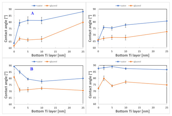 Figure 10A shows the change in wettability for unheated and heated samples with a titanium bottom layer and a gold upper layer with a total thickness of 50 nm. For a sample, at which 50 nm of gold was deposited without a titanium bottom layer, the measured water contact angle was 63.8°; for glycerol it was 61.8°. The influence of the lower layer of titanium was already very significant when its thickness reached 2 nm. For samples with 2 nm of titanium as the upper layer and unheated samples, the water contact angle increased by 25%; a less significant increase was observed for glycerol. The increasing thickness of the titanium layer led to an increase in the contact angle for both liquids. The presence of a titanium bottom layer in the samples induced a decrease in the water contact angle for all studied samples. The opposite effect was observed for samples with a gold bottom layer (Figure 10B). For subsequently deposited Ti, the water contact angle decreased for a lower Ti layer, followed by contact angle restoration at values still lower than for deposited samples without Ti. The subsequent heating of PLLA with an Au bottom layer stabilized the water contact angle at a narrow interval of 86–90°.
