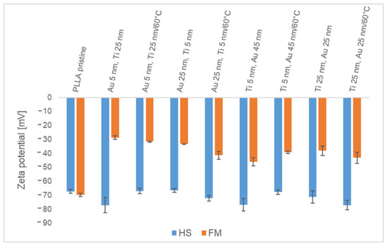 The results of the zeta potential measurements are shown in Figure 11. The values were obtained for gold and titanium bottom layer thicknesses of 5 and 25 nm, respectively, both for unheated and heated samples. The unheated samples with 5-nm gold and 25-nm titanium layers and with 5-nm titanium and 45-nm gold layers had a lower zeta potential compared to unmodified PLLA. In both cases, an increase in the thickness of the metallic bottom layers led to an increase in the zeta potential. The heated samples with a 5-nm metallic bottom layer had a higher zeta potential compared to unheated samples; the increase in thickness of the bottom layer led to a decrease in the zeta potential. For unmodified PLLA, the values did not vary significantly. If we compare the determined zeta potential and contact angle, it can be concluded that with an increasing contact angle, the zeta potential increased for unheated samples with a gold bottom layer as well as with samples with a titanium bottom layer.