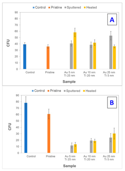 The number of colony-forming units (CFU) of Gram-negative bacterial strain of E. coli incubated with the samples with Ti and Au layers of different thicknesses. (A) 2 h, and (B) 24 h of contact of the bacterial suspension with the evaluated samples. The blue column represents the CFU of control (untreated bacteria), the orange column represents the CFU of bacteria incubated with a pristine sample, the grey, and yellow columns represent the CFU of bacteria incubated with Ti and Au layers (various thickness), respectively.