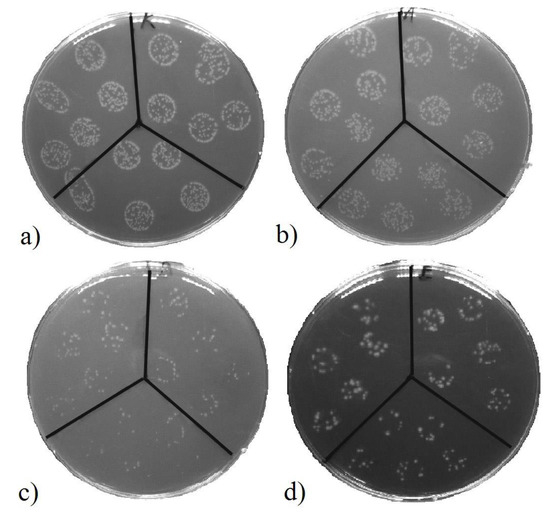 Growth reduction of E. coli on evaluated samples after 2 h of incubation. Images of agar plates with E. coli colony-forming units. (a) Control (incubated only in physiological solution); (b) Pristine (PLLA); (c) Unheated sample with 5 and 25 nm of Au and Ti layers, respectively; (d) Heated sample with 5 and 25 nm of Au and Ti layers.