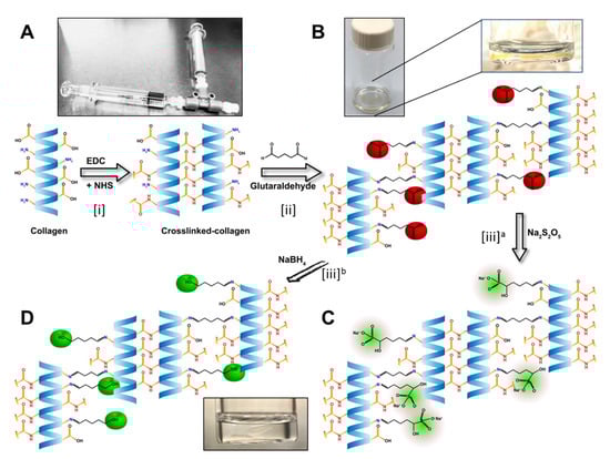 Stepwise illustration of the chemical reactions in the development of the biomaterials. (A) Illustration of the EDC/NHS crosslinking of the collagen. The T-piece syringe mixing system was used for making the hydrogels. (B) Hydrogels from the previous step crosslinked with GTA, leaving the unreacted aldehyde groups marked as red. Magnified image of a hydrogel in the GTA solution. (C) Neutralization of the free aldehyde groups with Sodium metabisulfite (Na2S2O5; in green). Alternatively, (D) neutralization of the free aldehyde groups by Sodium borohydride (NaBH4) and conversion of aldehyde group to alcohol groups (green).
