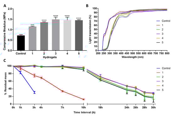 Mechanical and functional assessment of the collagen hydrogels, comparing the control (EDC/NHS crosslinked hydrogel) with double-crosslinked hydrogels with different concentrations of GTA (1, 2, 3, 4, and 5 PFGT hydrogels). (A) Compressive modulus was measured to evaluate the mechanical properties of the hydrogels. *** and **** represent p < 0.001 and p < 0.0001, respectively. (B) Optical evaluation of the hydrogels was carried out based on the analysis of light transmission through the different samples, from UV to visual wavelengths. (C) Treatment with collagenase was performed and residual mass (presented against time in hours (h)) of the hydrogels was calculated. For all panels, quantitative results were reported as the mean ± S.D. from three independent hydrogels and results were compared between groups.