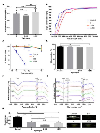 Water content of the control hydrogel was similar to non-treated PFGT 3 hydrogel, although there were significant differences between control and 3-SB and 3-SM hydrogels. However, for all hydrogels, the water content was more than 80% (Figure 3D).