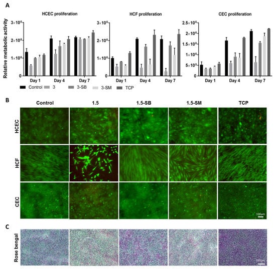 The biocompatibility of the hydrogels was tested using SV40-immortalized HCEC, kindly provided by Professor May Griffith, as previously reported []. The hydrogels were cut into 6 mm diameter segments and 5000 HCEC were seeded on top of each for culture with DMEM/Ham’s F-12 media (Corning, Manassas, VA, USA) supplemented with 10% Newborn Calf Serum (NCS) (HyClone, Logan, UT, USA), 10 ng/mL epidermal growth factor (EGF) (Life Technologies, Frederick, MD, USA), 5 ug/mL Human Insulin (Sigma-Aldrich, St. Louis, MO, USA) and 1% penicillin/streptomycin (Gibco, Life Technologies Corporation, Grand Island, NY, USA), at 37 °C and 5% CO2. Cells seeded on tissue culture plates (TCP) were used as control. AlamarBlue study was performed at day 1, day 4, and day 7 after cell seeding. At each time point, the tissue culture media was removed and replaced with fresh media (100 μL) containing resazurin sodium salt (0.004% w/v) and incubated for 4 h. Afterwards, the media (95 μL) were removed from each well and pipetted into a new 96-well plate and read on a BioTek plate reader (Synergy 2, BioTek Instruments; Winooski, VT, USA) at 530/25 nm for excitation and 600/25 nm for emission. At day 7, live/dead staining was performed with a staining kit (Life Technologies Corporation, Carlsbad, CA, USA), where cells were double-stained by calceinacetoxymethyl (Calcein AM) and ethidium homodimer-1 (EthD-1). Images were taken by using a fluorescence microscope (Zeiss Axio Observer Z1, Carl Zeiss Microimaging GmbH, Jena, Germany). The transcellular barrier function of stratified corneal epithelial cells was evaluated with the rose bengal anionic dye (Acros Organics; Morris Plains, NJ, USA) as described previously [].