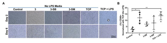 We wanted to determine whether the monocytic cell line (THP-1) when cultured for 5 days on different PFGT 3 hydrogels would differentiate towards a pro-inflammatory M1 (CD86) macrophage phenotype. When LPS was not added in the media, no morphological changes were visible; however, when LPS was used in the media, the change in cell size and morphology were observed on TCP, which proved the differentiation potential of the THP-1 cells (Figure 5A). Expression of CD86 was evaluated after 6 days of culture on different hydrogels and TCP with or without LPS. Significant overexpression of CD86 (polarization toward M1 inflammatory macrophage) was noticed only on non-PFGT 3 hydrogels compare to the control (p = 0.0109). CD86 expression did not differ significantly between 3-SB and 3-SM hydrogels and the control (Figure 5B).