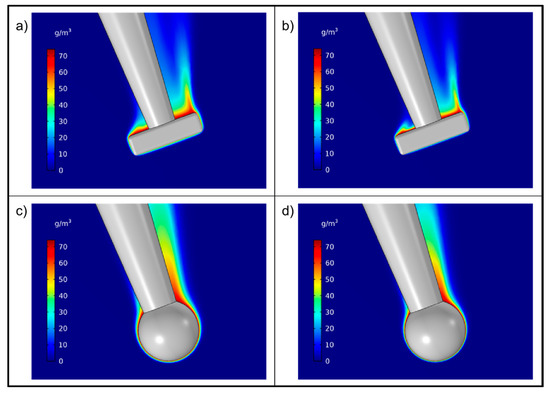 3) around the particle during dissolution, as obtained from simulations, is depicted in the symmetry plane. For the box particle, the layer of fluid containing an appreciable amount of dissolved drug is thin, even along the particle surface facing the incoming fluid flow and along the surfaces parallel to the fluid flow. For the particle surface on the reverse side to the surface facing the incoming flow, a thicker and more uneven drug layer was obtained with a spike at one box corner. For the sphere, a similar overall pattern was obtained but with a less heterogeneous drug layer on the reverse side of the sphere to the incoming flow.