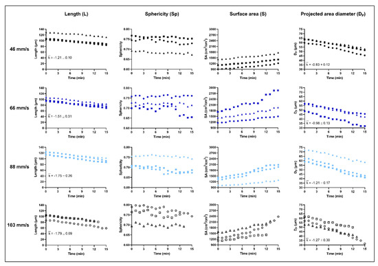 The and the of the particles decreased throughout the experiments approximately linearly with time and the decrease became more rapid with a higher fluid velocity, i.e., the average slope of the line (), calculated by linear regression, increased with an increase in flow velocity. The absolute surface area of the particle decreased with a reduction in particle diameter but the specific surface area increased during the dissolution process. The specific surface area profiles were nearly linear but tended to bend upwards with increased dissolution time.