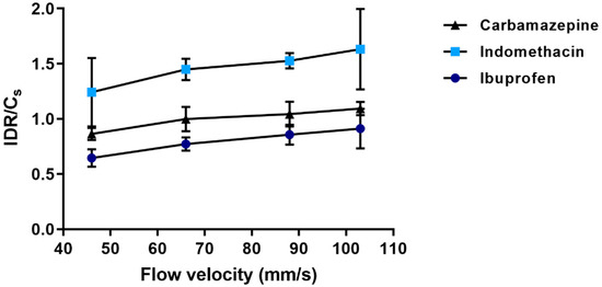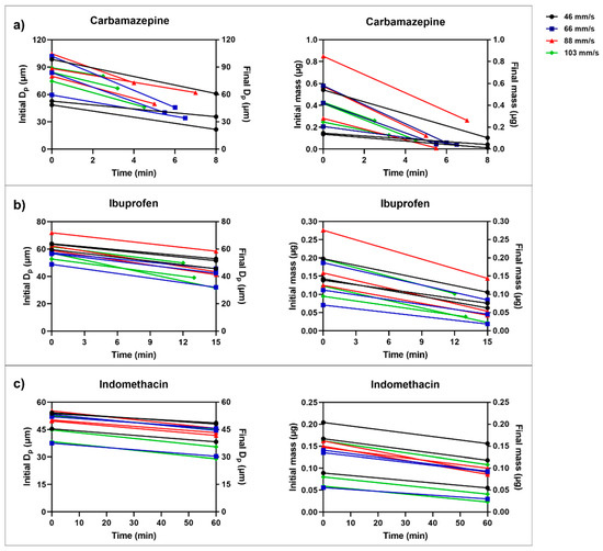 Figure 12). For carbamazepine, the single particles dissolved relatively rapidly, i.e., in about 4–5 min, while for indomethacin, the particle dissolution measurements were maintained for 60 min in all flow velocities.