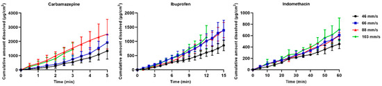 Figure 15). The particles dissolved in a nearly linear way, and with an increase in dissolved amount per time with an increase in fluid velocity. However, as mentioned earlier, one limitation was the difficulty in measuring the dissolution in the highest fluid velocity (103 mm/s). For example, carbamazepine could be measured for only a few minutes, which made the results somewhat uncertain in this fluid velocity. The most poorly soluble drug, indomethacin, could be measured for a time period of 60 min in all fluid velocities.