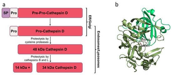 Cathepsin D maturation and structure: (a) Major steps of cathepsin D maturation. The description is in the text. SP—signal peptide; Pro—prodomain; kDa—kilodaltons; ER—endoplasmic reticulum. (b). Mature cathepsin D structure. The two domains are indicated in different shades of green. Catalytic Asp are represented as sticks. The structure was obtained from Protein Data Bank (PDB ID: 6QCB) [36]. The figure was made in the PyMOL Molecular Graphics System, Version 1.2r3pre, Schrödinger, LLC.
