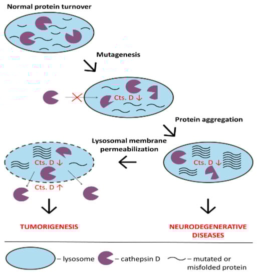 Role of Cathepsin D in cancer and neurological disorders. Cathepsin D mutations may cause a decrease in its lysosomal traffic and activity, leading to protein aggregation in the organelles and neurodegenerative diseases development. Protein aggregation may cause lysosomal membrane permeabilization with the subsequent increase of cathepsin D outside the lysosomes. On the other hand, the excessive extracellular activity of cathepsin D can contribute to tumorigenesis.