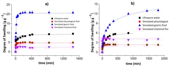Dried hydrogel samples with approximately 70.0 mg were placed in beakers containing 50.0 mL of either ultrapure water, simulated physiological fluid (pH 7.01), simulated gastric fluid (pH 1.21) or simulated intestinal fluid (pH 6.52). The masses of swollen hydrogels were measured at different times (from 3 to 2880 min). The degree of swelling (DS) was calculated using Equation (1):