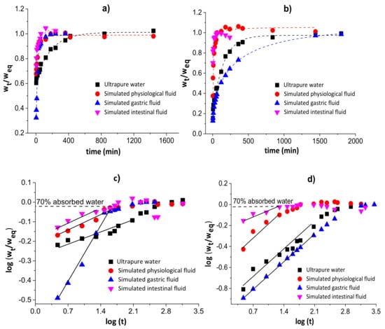 The water diffusion parameters were determined by considering the swelling of 60% of the biopolymer network due to the linear relationship between log(wt/weq) and log(t) []. Thus, the linear form of Equation (2) gives (Equation (3)):