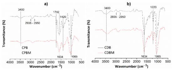 Figure 4 shows FT-IR spectra for chitosan/pectin (Figure 4a) and chitosan/DNA (Figure 4b) hydrogels without (CPB and CDB, respectively) and with loaded MB (CPBM and CDBM, respectively).