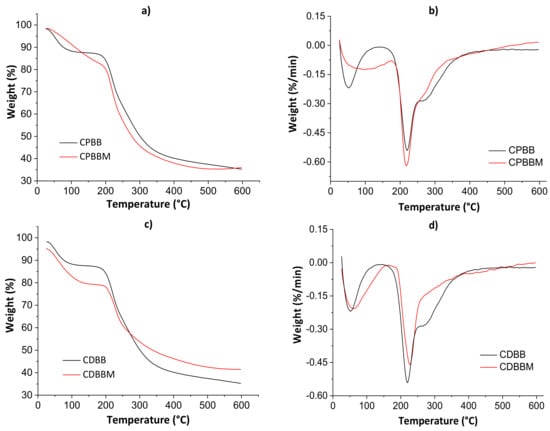 Thermogravimetric curves (a,c) and their derivatives (b,d) for both blends before and after the MB encapsulation.